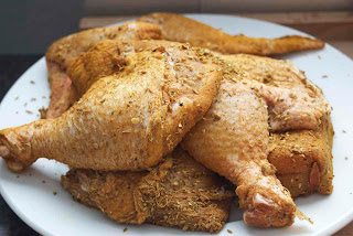 - Coat the chicken in the rub (large plastic bag is useful here)