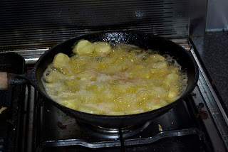 - Layer potatoes in the pan (careful it spits if the spuds are still wet)
