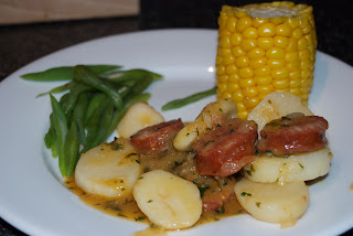- Plate up potatoes, corn and asparagas and then slice lamb into cutlets and whack it on too.
